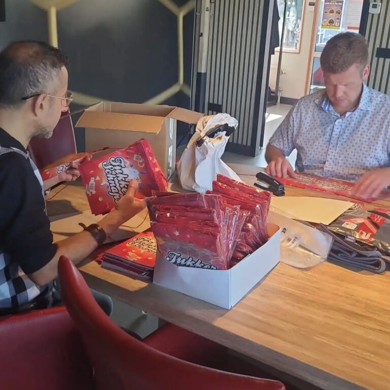 Van het zorgvuldig plakken van etiketten tot het samenstellen van geschenkpakketten en het oplossen van kleine productiefouten. De betrokkenheid is groot en de sfeer warm.