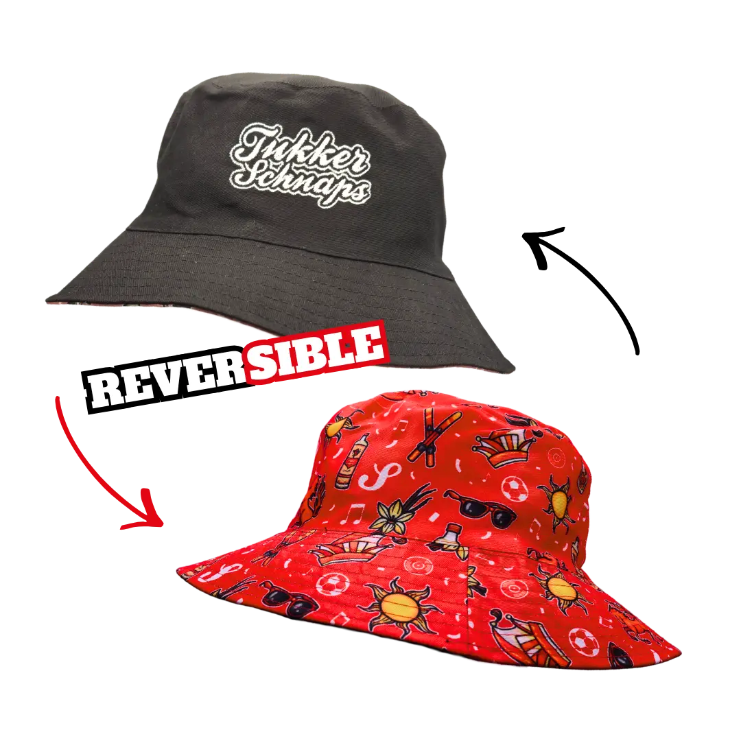 Limited edition Tukker Schnaps buckethat ter ere van ons 5-jarig jubileum. Deze reversible bucket hat heeft twee designs: een zwarte kant met Tukker Schnaps logo en een opvallende rode jubileumprint.